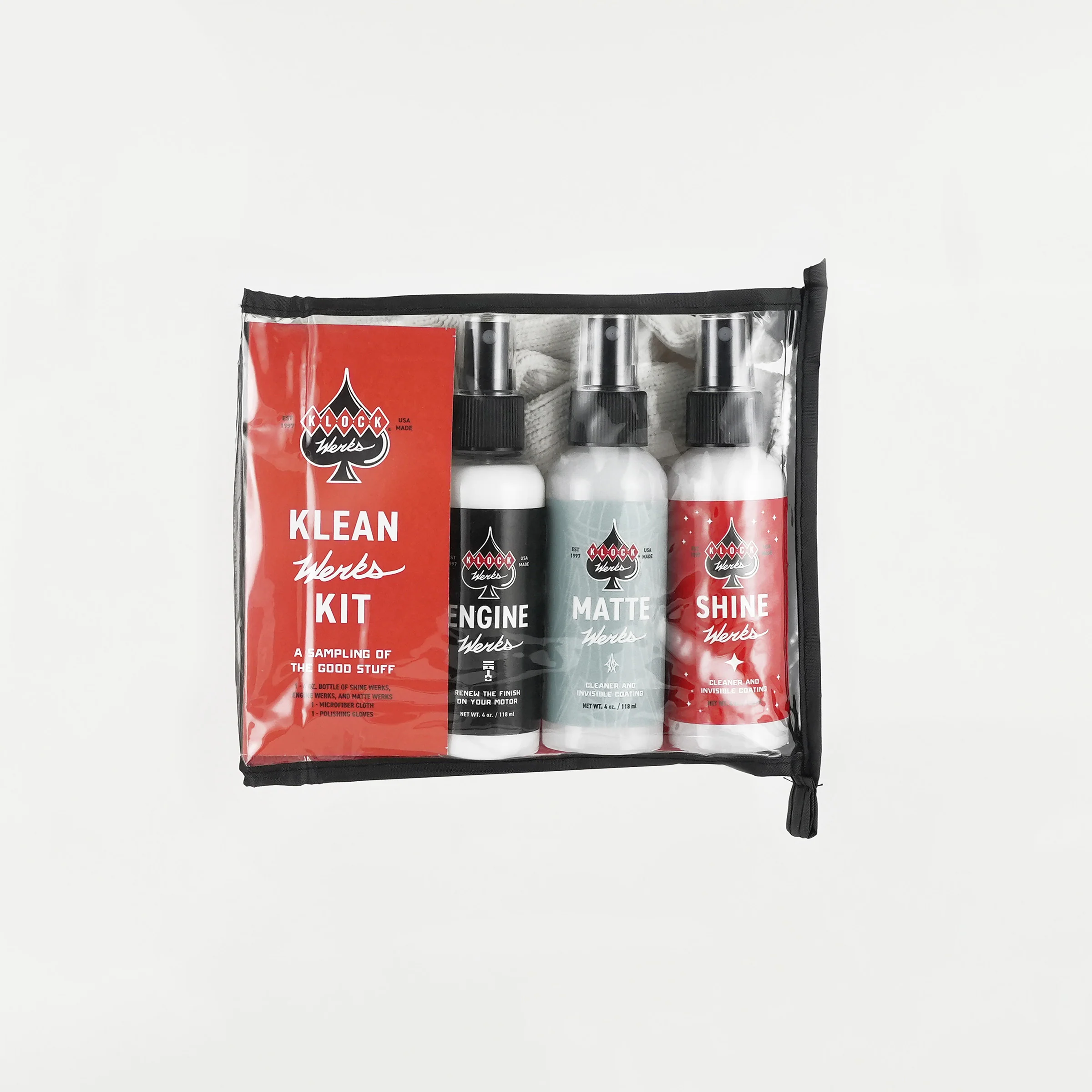 Our Klean Werks Kit is the ultimate motorcycle detailing and car detailing solution, designed for riders and drivers who want professional-grade results wherever they go. This compact kit includes everything you need to clean, protect, and maintain your vehicle’s surfaces, from painted finishes to chrome. Small enough to fit in your saddlebag, it’s perfect for on-the-go use, so your ride is always looking its best. Here’s what makes this the best motorcycle cleaner spray kit: